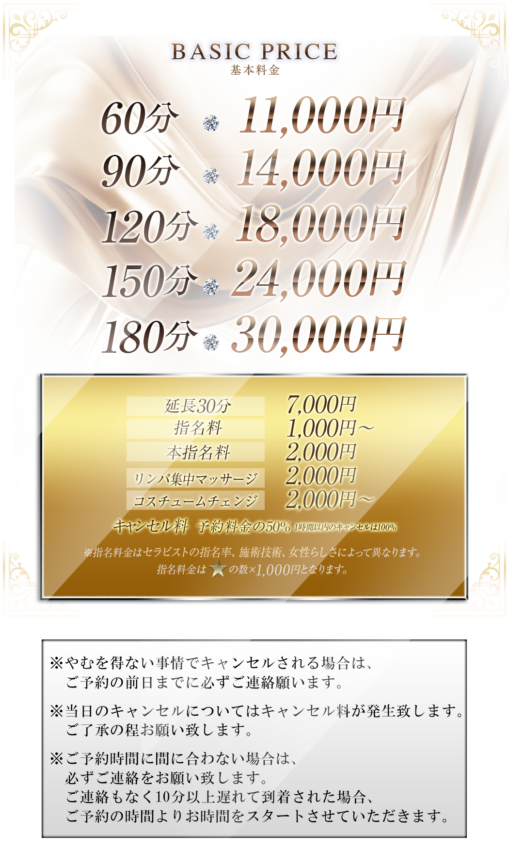 ■止むを得ない状況以外で予約時間を10分以上遅れて到着された場合は、予約時間よりお時間をスタートさせていただきます。
